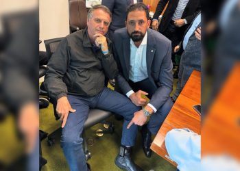 Bolsonaro exibe tornozeleira ao lado de deputado do PL; veja foto Ex-presidente Jair Bolsonaro exibiu a tornozeleira eletrônica na perna...