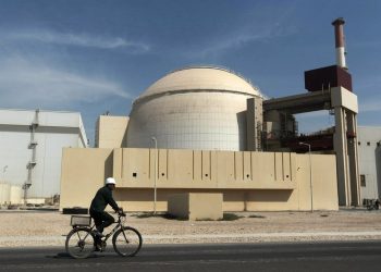 Ciclista passa em frente ao prédio do reator da usina nuclear de Bushehr, nos arredores da cidade de mesmo nome...